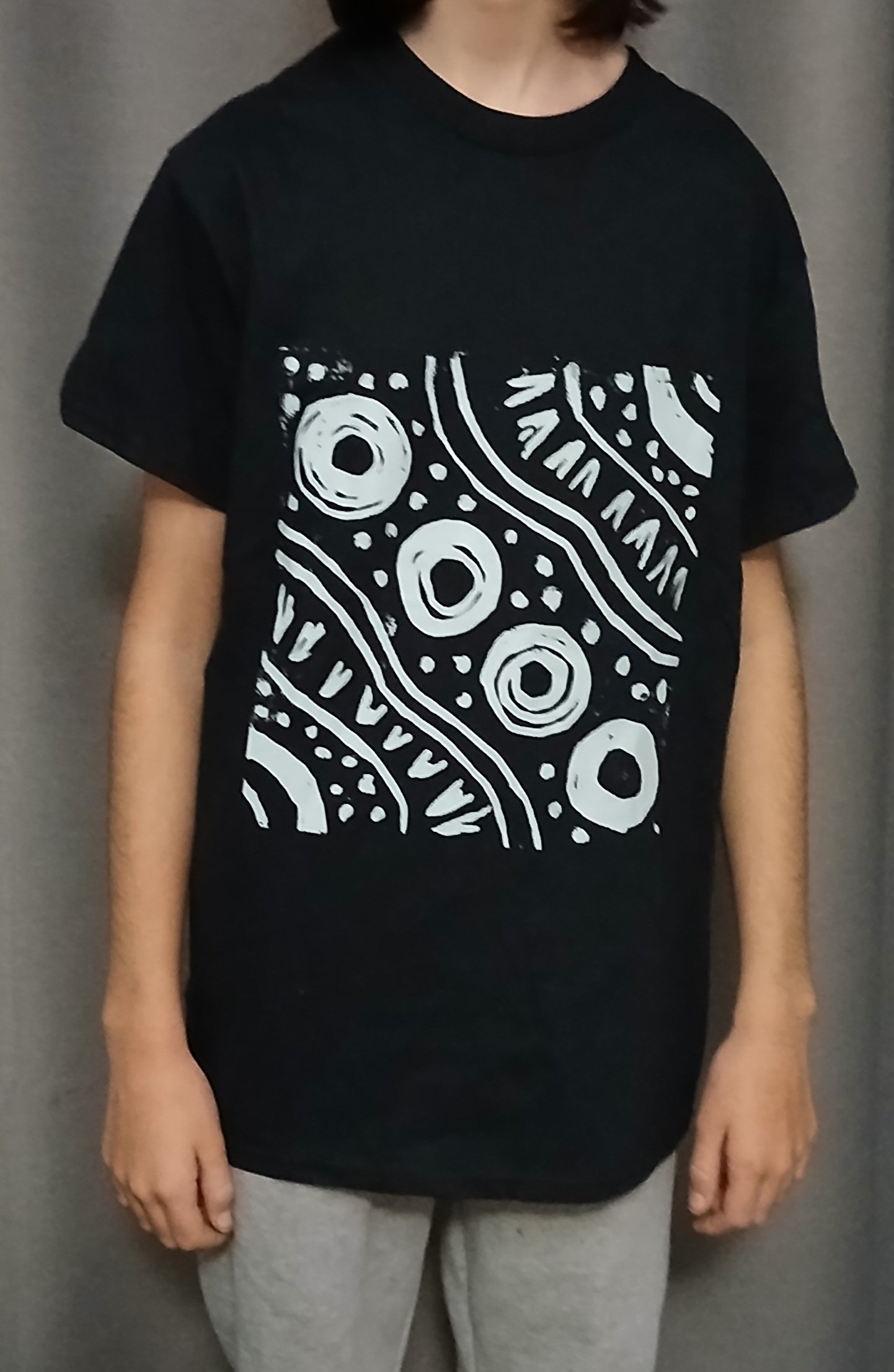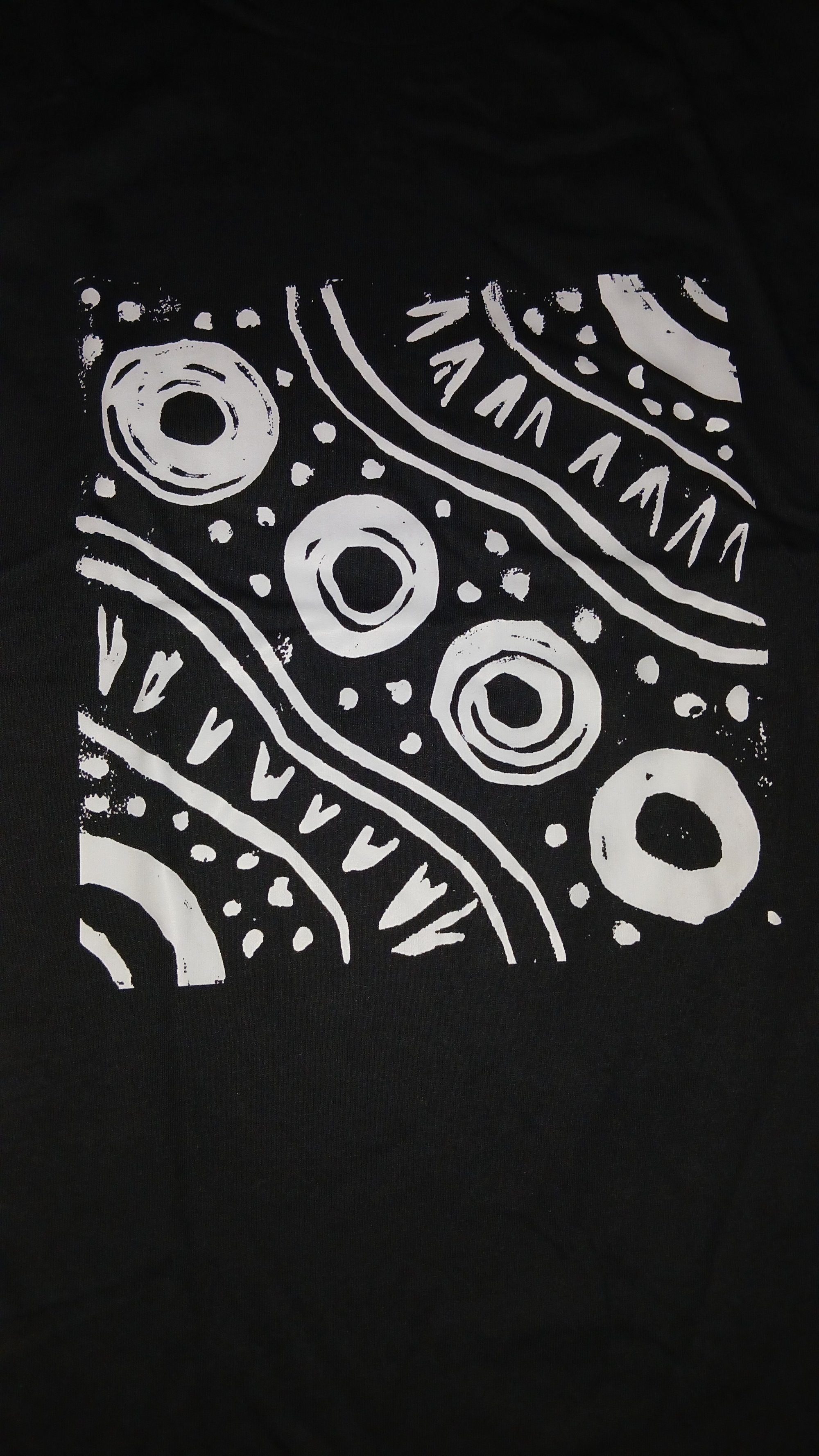 Inspired by the patterns of trees this design was originally a lino-cut. It is now available as a black t-shirt in the following sizes